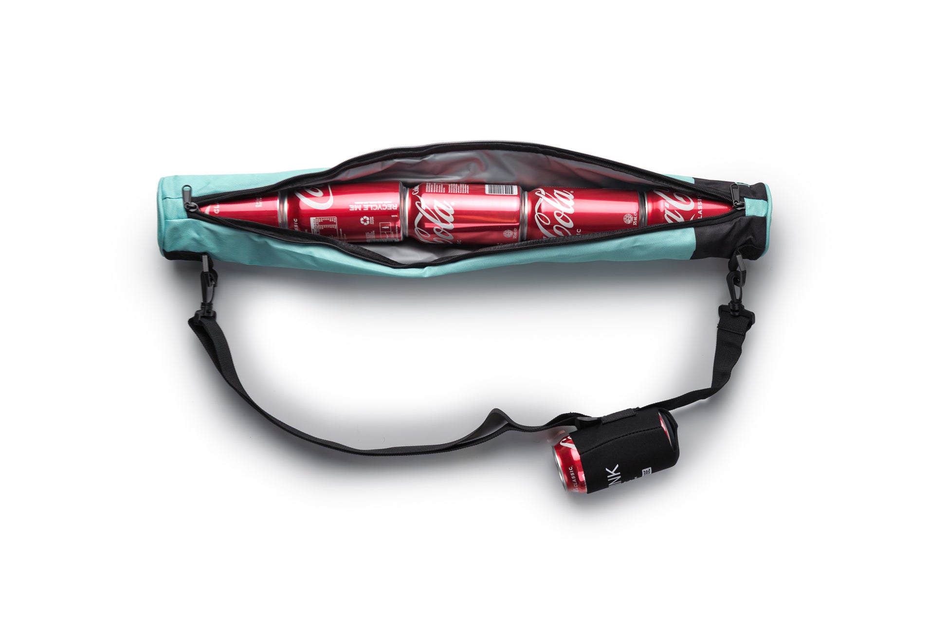 Keep a vertical stack of 5 cold ones in the insulated sleeve, with your traveler in the stubby holder on the strap!